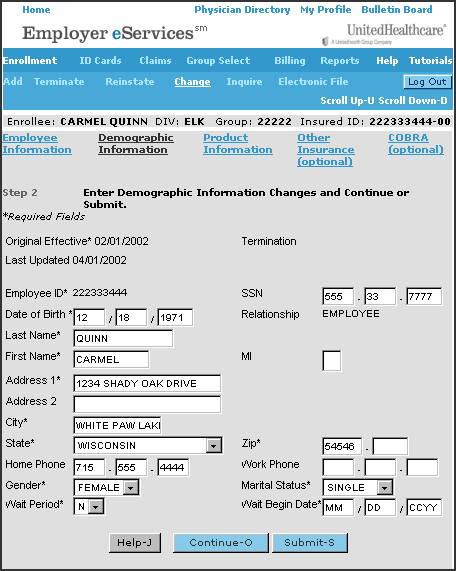 | Note: In our example we changed an employee. If the modified enrollee was a dependent the Employee Information and COBRA options will not display on this page. | ||