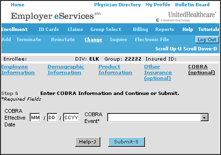 Use this page to enter or revise COBRA information. It is only available if the selected enrollee was entered into Employer eServices using Enrollment -- Add Employee. If you are adding or changing COBRA information both the COBRA Effective Date and the COBRA Event fields must be completed before submitting the changes. |