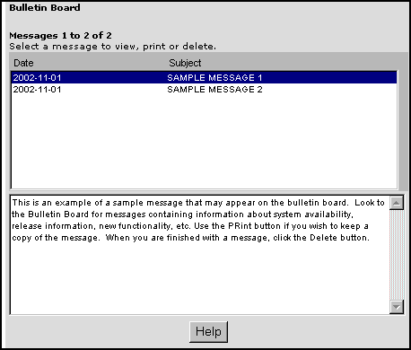 The top portion of the page identifies the number of messages on the bulletin board. In the sample to the left there are two messages that can be viewed, printed, or deleted. |
